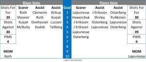 Anyone’s game in a wide open contest going into the third period and the go ahead goal almost fell for the Flyers two minutes in but Reece Harsch was robbed with an open goal at his mercy as the puck bobbled over his stick. With the Flyers on a man advantage Max Humitz with an absolute bomb rang the bar a few minutes later before the Flyers went back on the penalty kill. Blaze got nothing going on their powerplay and the game by this stage had noticeably fewer chances and looked to be drifting towards overtime before the visitors stunned their hosts. Troy Lajeunesse out on the left wing half boards got the puck to the net and somehow it found the twine with Kozun looking stunned as we entered the final two minutes. With 90 seconds to play and a face off in the Flyers zone the Blaze called a time out and inevitably withdrew Kozun for the extra skater. The Flyers who were second for most of the night at the face off dot came up big with Lajeunesse winning a couple of draws and eventually they forced the puck into neutral ice where Kyle Osterberg collected it and held off his marker to skate the puck down the ice and into the empty cage to seal an impressive road win and get the Flyers league campaign off to a positive start.