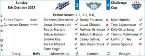 The Stars had the first few chances of the final period and the best of them fell to Rinaldi who was denied by Owen in the splits going post to post.  Stars indiscipline once again hindered their chance to take momentum in the game as Kris Inglis was called on a 5 minute major for boarding Adam Holwell who thankfully managed to skate to the bench under his own steam after being down on the ice for a short spell. A hit that wasn’t necessary and in the numbers. The Flyers created a few chances in the five minute spell, Jonas Emmerdahl rang the post then Carr shouldered a drive from Casey Gilling out of play. After another mammoth kill the Stars went on their own man advantage which the Flyers killed comfortably. A too many men call on the Flyers when they had returned to full strength gave Stars another opportunity but the Flyers kill was on the mark and the teams returned to even strength only for the Stars to get called for an extra skater. The Flyers didn’t need another goal and were careful not to give up anything and played a conservative powerplay leaving the Stars just over two minutes when they returned to full strength to salvage something. Carr was pulled for an extra attacker with two minutes remaining as Fife called their time out and despite the Stars spending most of the remaining time in the Fife defensive zone the Flyers were resolute to run out the clock to record a four point weekend which puts them in a strong position for qualification to the Challenge Cup quarter finals.