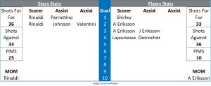 In a second period that was dominated by penalties the Flyers went on the powerplay a minute in and couldn’t get anything setup but with only two seconds remaining Anthon Eriksson drove the net and the puck found the twine off his skate. Another review followed and once again the correct outcome was arrived at and the Flyers had a two goal lead. Johnson responded for the Stars when he cut in from the left wing but Owen tracked him as he slid across his crease. Flyers increased their lead when Stephen Desrocher floated the puck high up the centre ice and after Johan Eriksson challenged for it Troy Lajeunesse swatted it high glove on Carr. A scrum in front of Shane Owen’s goal ended up with the goalie being piled on and from that resulted a Stars powerplay with the Flyers goalie, Desrocher and Stars Allen all picking up roughing minors. Stars capitalized with the man advantage to break their duck on their power play this season when Anthony Rinaldi was set up for his second goal of the night. The Stars forward having the whole net to aim for as Shane Owen was dragged out of position. A minute later and Kevin Carr made a solid save on Anthon Eriksson before the Flyers went back on a long 5 on 3 powerplay, their second of the game. Dundee called their time out and once again the Stars penalty killers came up huge to keep it a two goal game. Stars then had their own powerplay which resulted in very little before they ended the period again on the penalty kill but once again Fife failed to get anything set up.