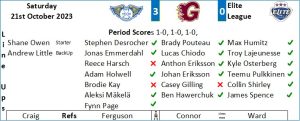 Having left the bench during the second period Teemu Pulkkinen failed to return to the game and Fife failed to get anything set up with their man advantage. Flames had the next penalty for too many men and Fife were able to find an insurance goal when Troy Lajeunesse swept the puck home. With six minutes remaining Flames had their fourth powerplay of the game and once again Owen denied them an entry on the scoresheet with a couple of solid saves. The final three minutes of the game saw the Flyers on the powerplay and the highlight was a larcenous stop by McAdam on Collin Shirley – we are used to seeing Shane Owen in the EIHL saves of the week highlight package but this one will surely be hard to beat this weekend?