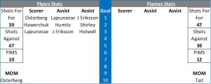 The first big chance of the game fell to the visitors when Ryan Tait burst through the middle of the ice to go in alone on Shane Owen who denied him when he shut down his five hole attempt. Fife settled into the game and they opened the scoring a little over the four minute mark when Eamon McAdam was guilty of giving up a juicy rebound from a Troy Lajeunesse drive and Kyle Osterberg fired the puck into the net from the left side face off circle. The visiting keeper once again looked unsteady when he failed to hold a Johan Eriksson shot and the puck was thankfully scrambled away from his perspective. Flames went on the games first powerplay when Teemu Pulkinnen was called for Unsportsmanlike Conduct for shooting the puck after the whistle but the Flames couldn’t get any momentum and the Flyers killed it with some ease. Shortly after returning to full strength Shane Owen robbed Logan Fredericks who broke in on a 2 on 0 but couldn’t beat the Fife keeper. Moments later Flames thought they had the game tied in the 12th minute but the play was reviewed and washed out for interference on Owen in his crease. The game at this stage had become a real track meet as both sides traded chances off the rush and it was the Flames who were looking the more dangerous but Owen stood his ground with no further goals before the period break.