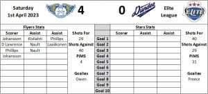 Flyers have four players with two goals who are top scorers in this season’s encounters with Stars – Johan and Anthon Eriksson, Troy Lajuenesse and Collin Shirley. The Stars top scorer in these games is Anthony Rinaldi with three goals.