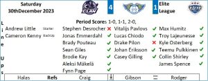 The Fife Flyers and Glasgow Clan faced off in front of a sold out Braehead Arena, reported afterwards as their highest ever attendance, for the first of a pair of back to back games to round out 2023. This was the Flyers second visit to Glasgow in the league and they were without the injured pair of Shane Owen and Stephen Desrocher but were able to welcome back Collin Shirley to the lineup after missing the last four matches. Unfortunately the paperwork to register the signing of netminder Kevin Lindskoug wasn’t able to be completed in time him for him to ice and in keeping with the Flyers run of fortune lately Drake Pilon arrived in the country this morning only to find that the airline had mislaid his luggage and therefor his equipment, both players were on hand to witness the action. Glasgow were without the injured Philippe Sanche and Michael Pelech and started Jake Kielly in net who had  shut out the Flyers in the opening match of the season.