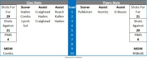 Into the third period and Haden on a fly by the Flyers net saw his tip shot just go wide. In the 43rd minute the Flyers again had a breakaway this time Chiodo getting some daylight between the defenders and Kielly did enough to keep the puck out with claims of a slash on the hands of the Flyers player as he bore down on goal. Humitz then brought out a glove save with a shot from the circles before the Clan went on their second powerplay of the match and once again took full advantage when Craighead took the puck to the net and it rolled underneath Little before Luke Lynch applied the finishing touch into the empty net. Cody Sol was next to test the visiting keeper but Little did well to hold his shot through a number of bodies. Clan went back onto the powerplay with four minutes remaining but the Flyers kill got the job done with their best chance being a Reid Petryk shot which Little made a pad save on. With a little under two minutes remaining the Flyers went on the powerplay and the Flyers called their timeout. As soon as the Flyers won possession of the puck they pulled Little to go 6 on 4 skaters and almost gave up the empty net goal through utter misfortune when Mäkelä had his stick break on the blueline but Lynch missed the yawning cage and the Flyers reentered the Clan zone. There was one big scramble in front of Kielly where Sol took no prisoners with a cross check on Pulkkinen. With the clock ticking down the Flyers tried to keep the puck alive along the boards but Sol from his own circles fired the puck down the ice and with a second remaining he hit the empty net.
