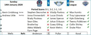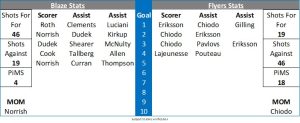 The Blaze were first to threaten in the third period when Carter Allen tested Lindskoug from distance who held on well. The Flyers were back in front in the 45th minute when Giles and Osterberg made a nice passing move and the former made a great cross ice pass to Lajeunesse who swept the puck home. The next minute and David Clements had a hard shot saved by the shoulder of Lindskoug. Flyers couldn’t hold their lead for long and a little over three minutes after taking the lead they were back on terms as the Blaze captain Brady Norrish came down the right wing and placed a shot above the pad and below the blocker into the corner of the net. In the 51st minute Dudek cut inside and unleashed a fierce shot which was well held by Lindskoug. On the next shift Dudek again brough a fine save from the Flyers keeper as he held the Blaze forwards shot in his glove. Blaze had all of the pressure but the Flyers were defending resolutely and were happy on many occasions simply to clear their own zone and take the icings. With four minutes remaining there was a sniff of a chance for Chiodo who was just inches wide of the post after he picked up a rebound close in from Kozun. The Flyers kept the Blaze at bay to force overtime with a point secured.