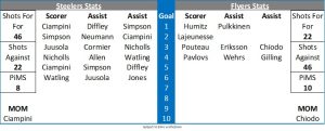 It was an all action start to this one with the first chance coming after just 11 seconds when Brien Diffley walked in from the bluelines and Kevin Lindskoug had to be alert to hold the puck. From the restart the Steelers got puck possession and Diffley went round the back of the net and his centering pass was poked home through the legs of Lindskoug by Daniel Ciampini after just 19 seconds. The Flyers responded immediately and 10 seconds later they were level as Teemu Pulkkinen stripped the puck from Dominic Cormier behind the net and the puck squirted out to Max Humitz who one timed it past Anthony Morrone. Mark Simpson shot across the face of an open goal in the 4th minute and a minute later Colton Saucerman walked in from the high slot but drove his effort wide of net. The Flyers went close in the 6th minute as Drake Pilon picked up a deflected puck at the side of the net but Morrone tracked it well and got across his goal to make the save. Flyers were doing well at the face off dots and a couple of wins in succession saw them put long range efforts on Morrone who handled them well. The Steelers however went back in front in the 7th minute when Lindskoug was unable to freeze the puck and as it lay around his crease Simpson collected it and stuffed it home with claims of contact on the Fife netminder from Ciampini. The call on the ice was goal and after a coaches challenge the decision was upheld resulting in the Steelers going on a powerplay. Sheffield made the advantage count as they opened up a two goal gap when Mikko Juusola had lots of time and space at the top of the circles and his drive found the net despite Lindskoug getting a piece of it. Moments later and the Flyers were nearly within a goal as Casey Gilling set up Lucas Chiodo and Morrone got just enough on his hard shot to send the puck dribbling past the post. In the 11th minute the Steelers were back on the powerplay and they generated a couple of very good opportunities but Lindskoug was equal to them to keep the Flyers in the game. In the 15th minute Mitchell Balmer dipsey doodled in the high slot and rifled in a shot that just grazed the crossbar with Lindskoug looking like he got the top of his glove to it. Juusola wired a shot wide on a 2 on 1 and the Steelers ended the period with a powerplay, half of which would carry forward to the second period as Osterberg picked up an extra two minutes in a roughing altercation with Brett Neumann who left the ice and did not return.