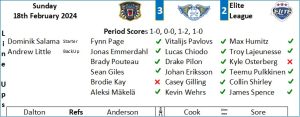 Dominik Salama had the first save of the game in the 2nd minute as Panthers dominated the early possession. A minute later and Anthony Luciani tested the Fife goalie again who smothered the puck. From the face off however the home side took the lead when the puck bounced off Kevin Wehrs skate and fell nicely for Alexander Lunsjo who finished clinically with a shot high over Salama’s glove into the top corner. It was all Panthers and in the 7th minute after a prolonged cycle in the Flyers zone Lunsjo once again tested Salama. The Panthers went on the powerplay in the 8th minute and the Flyers did well to kill with two big shot blocks and Salama twice making saves from Carl Neill. The Flyers were almost punished in the 10th minute for a defensive zone turnover but Salama denied Jake Ryczek and moments later Westin Michaud was also thwarted by the visiting goalie. The Flyers first cohesive attack came in the 12th minute when Troy Lajeunesse and Teemu Pulkkinen made a good zone entry but a Panthers stick deflected the shot into the netting. Moments later Brady Pouteau stepped up on the bluelines and put the puck on net which took a deflection and rang the post. The Flyers first shot on goal was recorded in the 17th minute when Collin Shirley and Drake Pilon broke and the formers shot was saved by Stojanovic who also held his ground to stop Aleksi Mäkelä. Neill fired one off the shoulder of Salama with two minutes to go before Shirley drove the net but the Panthers netminder tracked him across his crease. Salama had the final save of the period when he stopped Stephen Anderson on a break.