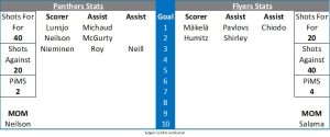 Flyers controlled the puck from the face off but when they gave it up the Panthers went the other way and snap shot by Otto Nieminen from the top of the circles found the top corner of the net to give the Panthers what could still be a massive second point.