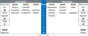 The Flyers started the third with a powerplay but it was the Devils who almost got the first chance when Sanford nearly had a breakaway but he let the puck slide off his stick. The Devils returned to full strength but in the 43rd minute they had the man advantage. The Flyers penalty kill again did a great job, allowing a couple of shots from distance, making a couple of big shot blocks but generally keeping everything to the outside. Just as the Flyers returned to full strength Alderson forced a shoulder save by Owen. In the 47th minute the Flyers sprung on a 3 on 2 break but Chiodo fired high over the crossbar with the Devils quickly countering and Brady Pouteau made a fantastic sliding block with his stick as the Devils threatened. Sanford was having most of the Devils chances and a minute later he again saw Owen come up with a solid save before then denying Martin on the follow up chance. The visitors almost had the lead for a fourth time when Chiodo stole into the Devils zone with the puck and he pinged a post with a quick shot before Martin then stripped the puck away from him as he tried the wraparound. Owen was back in action at the other end as he made a double save with a particularly strong effort to stop Brandt. The Flyers went on the powerplay with 8 minutes remaining but despite enjoying a lot of zone time and moving the puck around well they just couldn’t find an opening on Wall and with 30 seconds to go they were called for a penalty and so the teams skated 4 on 4. Osterberg and Pulkkinen combined well and Wall made a great save from the latter before the Devils returned to full strength and once again the Flyers penalty kill was solid with Cody Donaghey coming closest in the final seconds as he drove wide of the target. Trevor Cox had a tip at the post well saved by a sprawling Owen with 4 minutes to go. The Devils almost stole the points in the final minute but once again Owen stood tall as he flashed the leather to deny Justin Crandall from the slot.