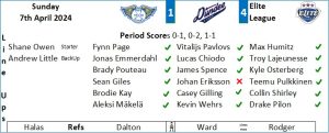The Stars made a bright start to the game and in the first minute Shane Owen was tested by a Jake Elmer shot. Immediately the Flyers went on the attack and Lucas Brine was in the game as he held a shot from Teemu Pulkkinen. The visitors however took the lead with the opening goal just over two minutes in when they transitioned quickly up the ice with Spencer Naas carrying the puck and as he went around the Flyers defenceman Owen tried a poke check and the puck bounced kindly off Ryan Valentini and into the net. The Stars went looking to build on their lead and in the 5th minute it was Valentini again who forced Owen onto a fine reaction save with a shot from close in on the Fife net. Owen was keeping the Flyers in the game in the early stages and again in the 8th minute he thwarted the Stars when he made a strong leg save from Anthony Rinaldi. A minute later Owen flashed the leather to snag a shot by Elmer. The Flyers closest effort so far came in the 11th minute when Brine made a toe save on a shot by Aleksi Mäkelä. Dundee continued to look the more dangerous side but neither side were finding clear cut opportunities on either net minder. In the final few seconds of the period Kyle Osterberg was denied as his top corner shot hit Brine’s stick and may also have brushed the crossbar.