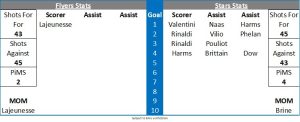 The Flyers needed the next goal as we went into the third period and within a couple of minutes they almost clawed one back as Lajeunesse forced Brine into a fine save and Dundee were happy to scramble the puck away. Flyers returned to the man advantage in the 46th minute and the Flyers were out of luck as Lajeunesse shot one off the crossbar. The follow up shift saw a goalmouth scramble and the referee awarded the Flyers a penalty shot. Lajeunesse took the shot and he beat Brine through the five hole to get the Flyers on the board and also ignite the crowd. The Flyers remained on the powerplay but the Stars manage to complete the kill. Shirley threatened the Stars goal in the 50th minute but his shot was again gobbled up by Brine. The Stars as the Flyers had done the previous night were content to play a passive posture to protect their lead and clogged up the neutral zone making it difficult for the Flyers to break through at speed as they looked to wind down the clock. Owen made another big stop with four minutes to go and with two minutes remaining the Flyers went for broke and pulled Owen for the extra attacker. Stars immediately had an effort on the empty net that hit a post and Brine then made a big glove save on Lajeunesse. Flyers called their timeout with just over a minute on the clock but the Stars won the defensive zone face off and a diving Brendan Harms swept the puck up ice and this time it found the empty net. The win moved the Stars back up into 7th place and the Flyers finished in 8th position with both teams looking forward to big games next weekend in a bid to make the play off finals in Nottingham.
