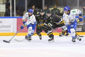 In the opening minute of the second period Panthers home debutant Zsombor Garat went down the left wing and fizzed in a shot that didn’t miss Owen’s far post by much. Chiodo carried the puck into the Panthers zone in the 24th minute and his shot from the slot hit the stick of Josh Tetlow and deflected wide of the net. The Panthers next chance in the 25th minute saw Hugo Roy go for a skate in the Flyers zone and as the space opened up his shot was saved by Owen with the puck rebounding off Brodie Kay and rolled towards the net before being cleared. The Panthers were enjoying considerable zone time in the Flyers end of the ice and after a long period of possession Owen swallowed a shot by Quinn Wichers. The third Panthers goal was only delayed a minute as Didrik Henbrant broke in on the Flyers goal and with Delmas trying to strip the puck a delayed penalty was called but Henbrant kept the puck alive and fed it to Sam Herr who from an angle managed to bank the puck off of Owen and into the net. The Panthers continued to press and the Flyers were lucky to survive another couple of chances in the next few minutes with firstly Matt Alfaro being denied by a pad save and then Owen stopping Henbrant as he saved the puck with his face mask. The home side killed the game with a couple of goals within a minute. The first in the 37th minute came after Kontos and Roy broke 2 on 1. Kontos took the puck around a sliding Tyler Heidt before releasing it to Roy who was able to walk around Owen and slide the puck home. The Panthers fifth came after they won another offensive zone face off and the puck went back to Tim Doherty inside the face off circle and his quick release beat Owen on the glove side just inside his post. In the final minute the Flyers had an odd man rush with Chiodo getting a shot away on Bednard who had to make a shoulder save as the puck rose up on him.