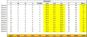 The Flyers month of December record over their EIHL seasons is as follows: