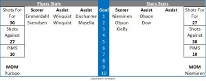 The Flyers doubled their lead at 43:30 with Didrik Svendsen finding the net glove side on Fiske with a spinorama move after being fed the puck by Winquist. The Flyers had the man advantage again in the 47th minute as Fiske was assessed a delay of game penalty for dislodging the nets. Fiske stopped a Winquist one timer and with 40 seconds remaining in the power play it became a two man advantage as Matthew Boudens tripped Scheid as he came out from behind the Flyers goal. The Stars held firm however with the Flyers not getting any clear looks. The Flyers then had to kill a penalty in the final 5 minutes as Dostalek was called for a high stick and the visitors took advantage to reduce the arrears. Purboo made the initial save on Matt Berry but could do nothing to stop Otto Nieminen knocking home the rebound. With 100 seconds on the clock the Stars pulled Fiske for the extra skater and Purboo flashed the leather to stop Drydn Dow. Stars called a timeout and on the restart laid siege to the Flyers net. With 5 seconds remaining an attempted clear was kept in out at the blueline by Dow who fired the puck on net and Hampus Olsson was all alone at the top of the crease to tip the puck high into the net and send the contest into overtime.