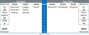 Owen made an aggressive save in the 42nd minute as he got out to take the net away from Neumann who was looking for his hat trick goal. The Clan man went close again in the 47th minute after sustained pressure in the Flyers zone but he fired wide of the net. A minute later and the Clan survived a scramble around their net with Aittokallio eventually covering the puck up. In the 49th minute a give and go between Richard Jarusek and McKay saw the later denied as Owen went post to post. Andrew McLean tried his luck from just inside the blueline and the puck deflected just in front of the Clan goalie but Aittokallio made a fine reaction save. Porsberger was the binned in the 53rd minute for a trip. Masella made a great shot block on Neumann as the Flyers completed the kill and Porsberger went the other way and set up Winquist who saw his rising shot saved by the big Finnish netminder. In the 57th minute Owen held a snap shot from Heard and with 2:16 remaining on the clock the Flyers with an offensive zone face off pulled Owen for the extra skater. The visitors controlled the puck and Winquist, Porsberger and Ducharme all had shots that Aittokallio did well to save. With the clock ticking down Deven Sideroff broke up ice and with the goal at his mercy Masella was forced to slash his stick and the Clan played out the final 18 seconds on the power play to take the win.