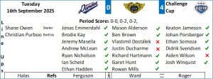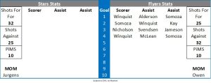 Owen was in action early in the third period as Hampus Olsson was in his kitchen. Winquist slipped the puck to Porsberger but he was denied by Fiske’s pads. In the 42nd minute Naas cut out from behind the net but Owen was square to his shot. The Flyers extended their lead at 44:18 and it was all down to the tenacity of the forecheck and hemming the Stars in their own end and when the puck found Ryan Nicholson he drilled home from the circles. The Flyers then went on the powerplay as Desouza was called for hooking and Garet Hunt went close as the puck caught the outside of the goal frame. Porsberger then struck iron and Ian Scheid fired the rebound wide of the open net as the Stars completed the kill. A Nicholson shot was bobbled by Fiske before the Stars goalie then had to cover up as Alderson crashed the net. In the ensuing scrum Jurgens was assessed a double minor for repeatedly laying the lumber on Winquist to send the Flyers back on the power play. Fiske was well out of the blue paint to shut down a Somoza shot before Didrik Svendesn got the gate for a high stick which was assessed as a double minor and the teams skated 4 on4. Matt Berry went close for the Stars but at 53:10 the Flyers iced the game with a fourth goal and it was all down to the composure shown by Andrew McLean to give Winquist a slam dunk into a gaping net with Fiske out of position. In the 55th minute Winquist on a break passed to Somoza and Fiske made a solid save. The Stars returned to full strength and a short 30 second powerplay which the Flyers killed. In the 58th minute Porsberger teed up Winquist for a one timer that went straight at Fiske. The Flyers ended the game on the powerplay as Jurgens took a boarding penalty against Svendsen and the visitors protected the shutout.