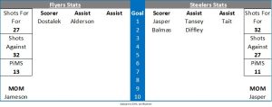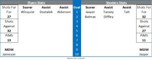 In the 41st minute Winquist broke down the left wing and dragged the puck around McAdam but couldn’t keep his feet and the puck slithered out of his reach. The Flyers survived a net front scramble in the 46th minute as the Steelers started to up the tempo and hold more of the territorial advantage. Dowd struck the outside of a post in the 48th minute with a shot from the circles and Jasper drove the net in the 51st minute but Owen tracked him all the way and managed to seal the bottom part of his net. The Flyers netminder made a huge save in the 52nd minute on Mitchell Heard. Porsberger had a chance in the 54th minute at the back post but he just couldn’t get the puck to go. Tait then showed his speed in the 56th minute as he barreled into the Flyers zone and tried to slip the puck five hole on Owen who shut the wickets. McAdam came up with a game saver in the 58th minute to deny Nicholson who had time and space down low on the rush. Winquist had the final chance of the game with 90 seconds remaining but again McAdam looked solid.