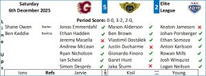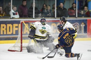 In the opening minute of the third period a mix up in the Flyers zone resulted in Somoza being called for a hook to send the home side back to the powerplay. Owen made a blocker save on Strang before Jack Jacome in the bumper position whistled the puck wildly over the bar. The Flames did however make their numerical advantage count as the puck was fed to Mathieu Gosselin in the left circle and his shot appeared to take a nick off someone on the way into the net. In the 44th minute Owen smothered a shot from the circles by Jacome and a minute later Fazio turned away a slapshot by Despres. Ryan Nicholson fired a shot that went in and out of Fazio’s glove in the 47th minute and a minute later Vlastimil Dostalek down the left wing centred the puck but it was airborne and Neilson couldn’t get a touch from the edge of the crease to put it on goal. In the 51st minute Porsberger saw his shot gloved by Fazio before the game was delayed around 5 minutes for a repair to the gate at the Flyers bench. On the restart the Flames missed a glorious chance as Strang walked around Owen but had the puck slide off his stick with the net gaping. The Flames continued to push and Strang went close again in the 54th minute with a back hand effort before the Flyers survived a scramble around their net when they knocked the puck off the line as the Flames continued to look for a tip in around the visitors crease. The game was settled at 56:16 as Gosselin got his second of the game after the Flames won puck battles below the goal line and the puck was fed out into the slot with Owen having no chance. Fazio made a save from Anton Karlsson in the final minute before Owen had the final word as he denied Tesink in the dying seconds.
