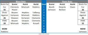 In the 21st minute Matthew Gleason from the circles saw his shot swallowed by Owen and a couple of minutes later Grant Mismash stickhandled his way through the Flyers defence and Owen had to be at full stretch to make a left pad save. Owen deflected  a Gleason shot over the crossbar in the 24th minute before the Flyers went back on the powerplay in the 26th minute as Kim Tallberg was called for interference. Booth went to the net and he slid his shot just wide but midway through the sides were at even strength as Ian Scheid was sent to the box for a hook as a giveaway in the neutral zone presented a breakaway for the Blaze. The home side extended their lead on the 4 on 4 play as Vertanen from the right wing fired the puck into the slot area and it hit Jeremy Masella on the glove to bounce behind Owen. The Blaze returned to full strength and a short powerplay but Owen shut down Power on the short side as the Flyers completed the kill. Blaze added another at 28:45 when Vertanen on a down low play found Gleason at the back post and he was strong on his stick to knock past a helpless Owen.   The visitors were at sixes and seven every time ethe Blaze entered their zone and at 31:00 the home side added another as Gleason was allowed to waltz around the slot area and his blind backhand pass found Boysen at the far post and again Owen had no chance. A heavy shot from Despres in the 33rd minute caused a rebound from Robson and he followed that up by scrambling a shot from Giordano Finoro away. A scrum ensued with Zaine McKenazie and Saucerman for Blaze and Flyers Winquist and Finoro each receiving double minors for roughing and delay of game. The Blaze were back on the penalty kill in the 34th minute as Pelech slashed the stick from Booth who had the early chance on the Flyers man advantage but again his shot was just wide. The powerplay was over after 30 seconds as Neilson got the gate for a slash as the teams skated 4 on 4 before a short powerplay for the Blaze that the Flyers killed. The Flyers conceded a 7th at 38:46 with another move that saw the Blaze go to the net and Mismash from close range converted Hopkins pass.