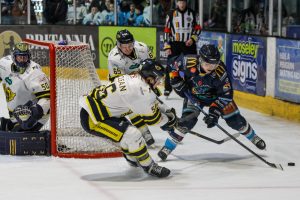 Just inside the 2nd minute David Booth showed some neat stickhandling to burst his way through the slot and force Michael Pelech into a hooking penalty to send the visitors onto the first powerplay of the game. The Flyers were quick to take advantage as Booth again stripped the Blaze defence for pace and went in alone on Robson to beat the keeper with a cool finish inside the post at 01:53. A shot from the high slot by Logan Neilson in the 3rd minute brought a pad save from Robson and in the 5th minute a shot from the blueline by Ben Brown was labelled for the top corner before Robson got his blocker on it. It was a bright start for the visitors and the Blaze had their first shot on goal in the 6th minute when Colton Saucerman from the high slot forced Owen to blocker the puck away. In the 7th minute Anton Karlsson was called for a high stick to send the Blaze on the powerplay. Elijiah Barriga tried to go short side but Owen was alert and Justin Ducharme had a big shot block in the slot as the Flyers completed the kill. David Clements was denied by Owen in the 10th minute and the Flyers went down ice with a Neilson shot resulting in a rebound that was wouldn’t fall for Milan Lucic and Robson scrambled the puck away. The Blaze were down a man after 11 minutes as Sam Ruffin went to the dressingroom and would not return. At 12.34 the Blaze levelled the contest as Clements fired a shot from the point through a crowd of players who parted and the puck found the top corner on the blocker side of Owen. Grayson Constable then found space in the slot in the 14th minute but he couldn’t hit the target with the Blaze going back on the powerplay a minute later as Keaton Jameson was called for a slash in the neutral zone. The closest the Blaze came was a one timer from Jere Vertanen that Owen smothered but just as Jameson stepped back on the ice the Blaze took the lead when Jordan Power beat Owen with a top shelf finish from below the left circles at 16:29. Booth had a deflected shot on the 17th minute that Robson had to react quickly to but at 17:19 the visitors were back on terms as Neilson fed the puck into the slot from the right wing and Jameson going to the net stuffed the puck past Robson. The Blaze were back on a powerplay before the end of the period as Josh Winquist was binned for a trip and on the delayed call Owen made a huge pad save on Connor Russell. The home side however got their noses in front before the break as a pass through the crease by Jack Hopkins was missed by everyone but William Boysen at the back door was able to convert from a sharp angle.
