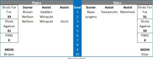 Overtime commenced with a Stars 4 on 3 powerplay for 30 seconds which the Flyers were able to kill and the teams continued without a whistle at 4 on 4 with much of the game being played in the Flyers zone as the Stars controlled the puck. The Stars were called for too many men however with 02:20 to play to put the Flyers on the powerplay. The home side called their time out. Kruse produced a blocker save to deny Neilson and then followed that up with a stop on Winquist. The Flyers were camped in the Strs zone and Ian Scheid had three attempts in quick succession that all missed the target with the final one however being recycled and Winquist at 64:39 feathered a pass to Neilson who hammered the puck top corner past Kruse to win the game for the Flyers with just 1 second of the man advantage remaining.