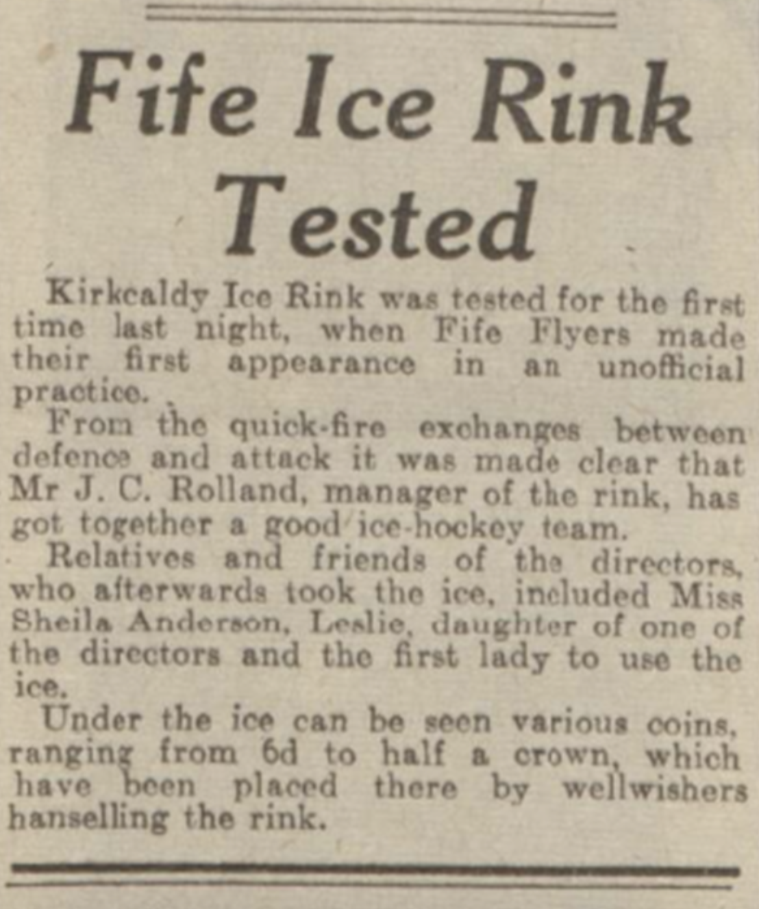 The Rink was officially opened on Saturday October 1st and was the realisation of the dreams of Kirkcaldy and district skating enthusiasts. Already, the Fife Flyers had been practising hard for the opening of the season and the people of the town and district were eager to see them in action.